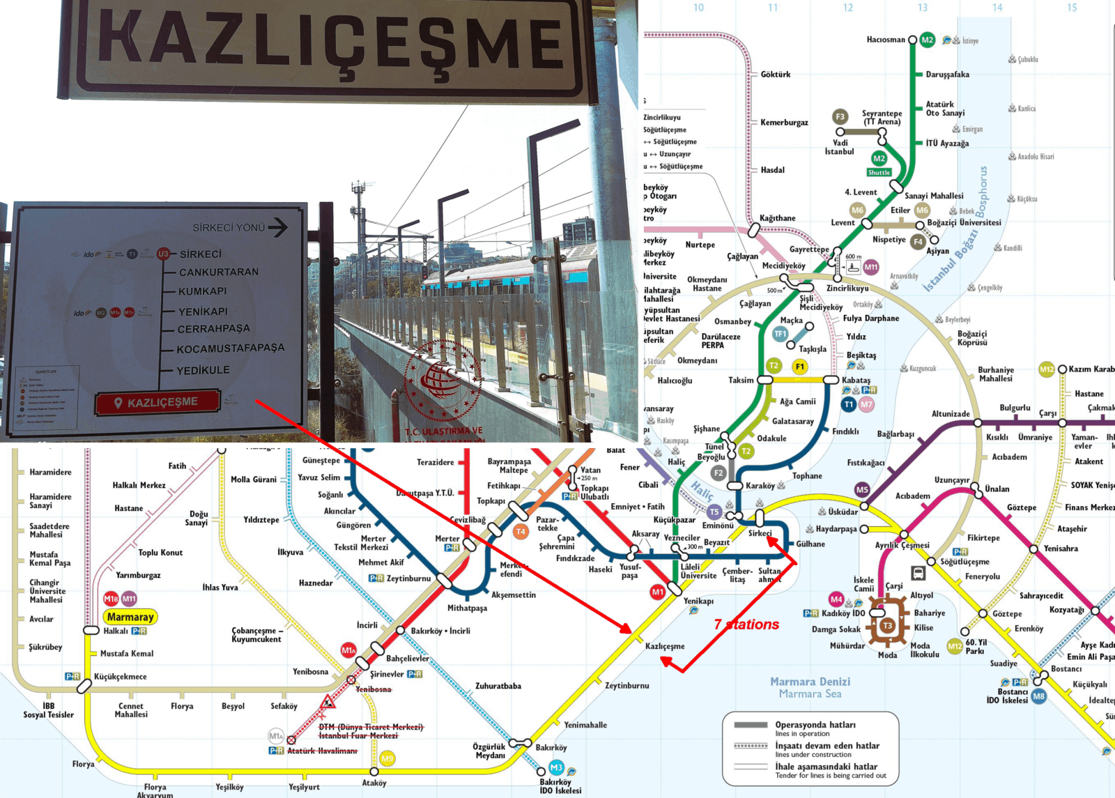 Visite de la vieille ville, direction la station de Kazlicesme à côté, passage du portique rapide (T6 ou U3) c'est celui de droite, sortie à Cankurtaran en 10 mn de métro (6 stations), puis direction une des zones les plus animées de la ville soit la splendide mosquée Bleue (Sultanahmet Mosque), est à côté la non moins fameuse Sainte Sophie (30 €), ancienne église devenue mosquée, puis redevenue église pour enfin sous Erdogan redevenue mosquée. L'audiophone à l'entrée est indispensable pour comprendre son historique et la complexité de ses choix. Entre ces deux visites n'oubliez pas l'étonnante place de l'hippodrome. Nous sommes déjà l'après-midi, direction le parc ombragé de Gulhane et le surprenant quartier de Sirkeci très animé, a noter que tout cela a pied sans aucune difficultés. Vous êtes donc à Sirkeci. Suivez les rails du tramway la première station vous ramènera directement par le U3 (T6) pour mémoire terminal Kazlicesme.